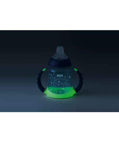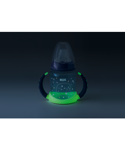 Láhev NUK First Choice Night je ideální pro děti od 6 měsíců, které se učí pít samostatně. Ergonomické úchyty, které svítí ve tmě, pomáhají dítěti snadno láhev uchopit i v noci.